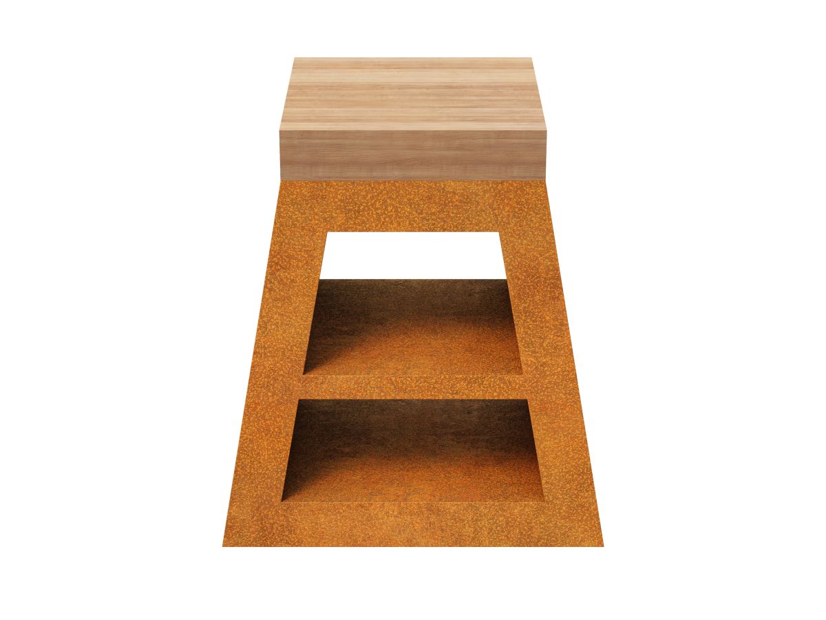 MESA 1 ist ein kleiner, geometrischer Tisch aus Cor-tenstahl. Er ergänzt die Serie COCCINA perfekt mit einer zusätzlichen Arbeitsplatte, einem Regal für Zubehör oder Platz für Holz. Er ist standardmäßig mit verstellbaren Beinen ausgestattet, kann aber mit Rollen versehen werden, um den Tisch mobiler zu machen. Perfekt für Verkostungen, Präsentationen, Feste oder einfach auf der Terrasse oder im Garten.
